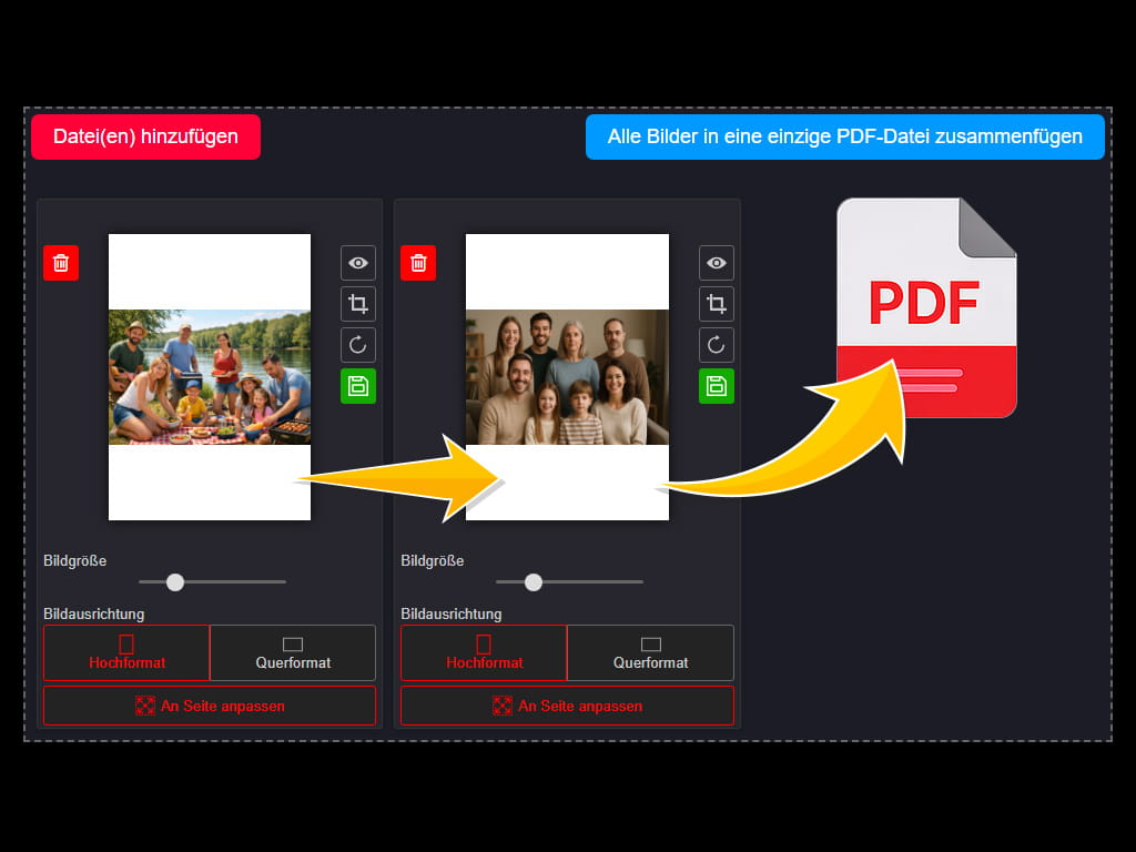 Sie können mehrere Bilder gleichzeitig hochladen, jedes Bild vor der Konvertierung einzeln drehen und alle konvertierten Dateien in einem Schritt herunterladen.